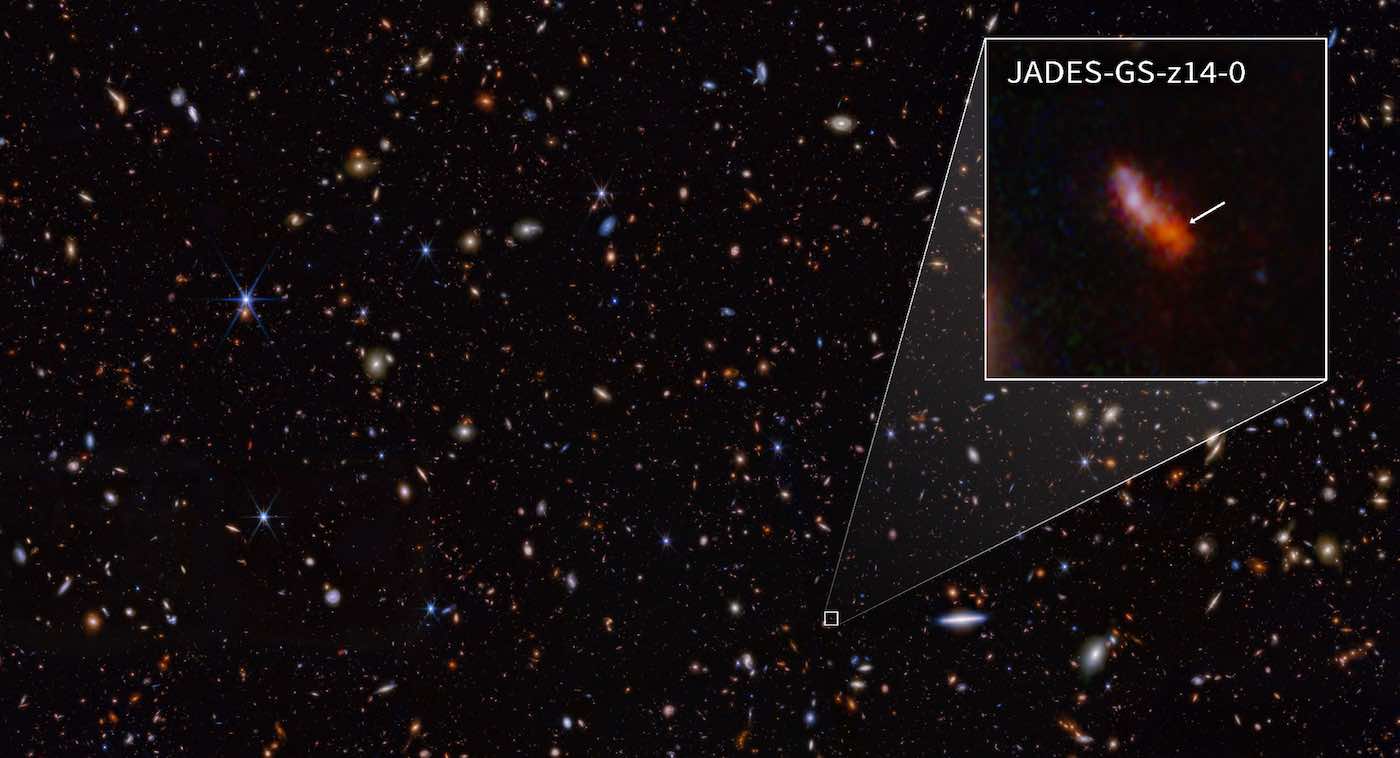 According to NASA, in addition to being the new distance record holder, JADES-GS-z14-0 is remarkable for how big and bright it is. JWST measures the galaxy over 1,600 light-years in diameter. Many of the brightest galaxies produce most of their light through gas collapsing into a supermassive black hole, producing a quasar. But the team says JADES-GS-z14-0’s large size means the light must be produced by young stars.